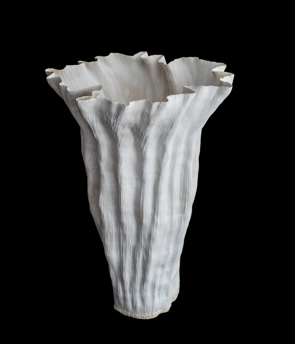 ‘I imagine these vessels as speculative artefacts – future remnants of our planet that draw on deep geologic time, fossilisation and the ephemerality of existence. As a designer living in an age of mass production and ecological collapse, I explore future material and biological ecologies in my practice, envisioning futures that branch away from the moribund predictions of today. My process is material-led and labour-intensive; it’s antithetical to the mass produced. I employ slab-building, carving, coiling and hand-building methods. Each vessel is high-fired, inviting shifts in form, welcoming movement, dynamism, and the ferocity of heat and earthly elemental forces.’ – Kohl Tyler